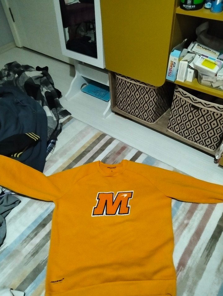 Sarı, bol kesim, uzun kollu ve bisiklet yaka sweatshirt. Önünde renkli baskılı 'M' harfi ve cırt cırt detayı bulunur. Yumuşak ve sıcak dokulu kumaştan üretilmiştir.