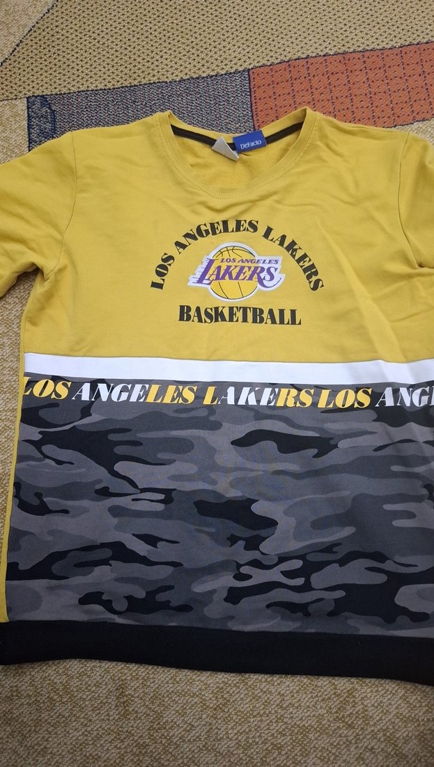 Sarı renk, kısa kollu, yuvarlak yaka erkek tişörtü. Los Angeles Lakers baskısı ve gri kamuflaj deseni ile rahat kesim. Sentetik kumaştan, trend görünüm sağlar.
