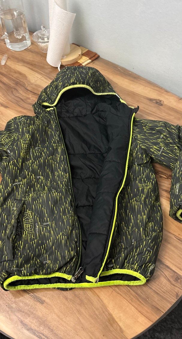 Sarı baskılı desene sahip, fermuarlı ve notched lapel yakalı, dar kesim erkek çocuk ceketi. Sentetik kumaştan üretilmiştir.çift taraflı giyilebiliyor