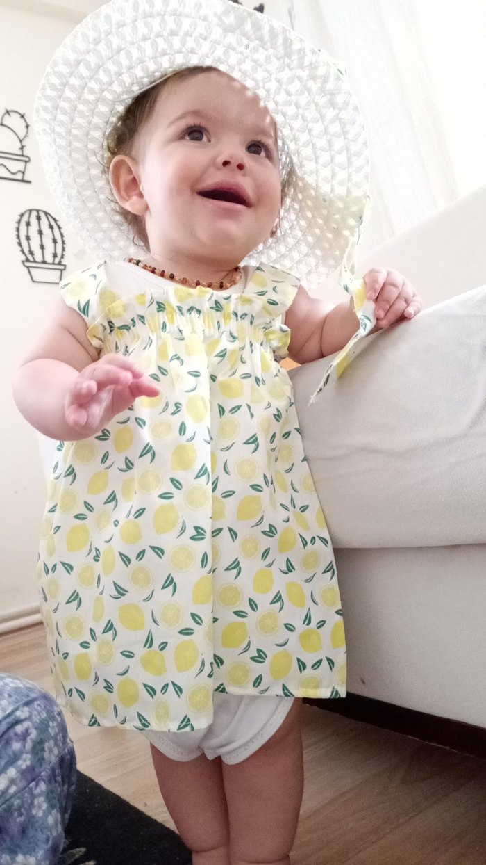 Açık sarı renkli, baskılı limon desenli ve fırfır detaylı bebek elbisesi, sıcak günler için uygun şapkası ile beraber satılık