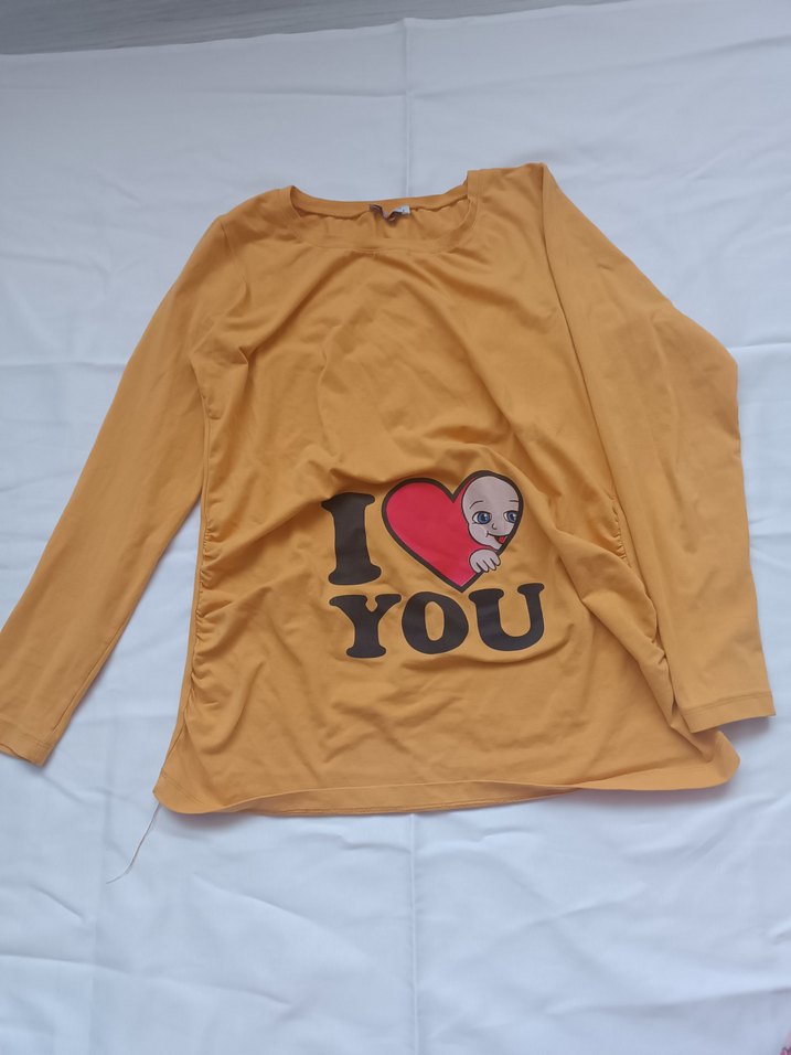 Sarı uzun kollu hamile bluzu, yuvarlak yaka ve bol kesimlidir. "I ❤️ YOU" ve bebek figürlü renkli baskı vardır. Günlük kullanıma uygundur.