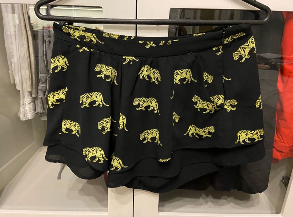 Sarı baskılı kaplan desenleri ve fırfır detayları ile bol kesim, kısa hamile mini şort. Sokak stili ve parti için uygundur.
