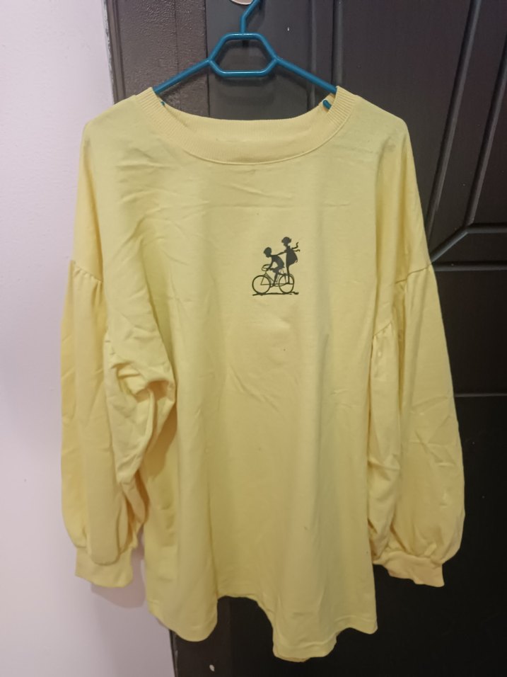 Yumuşak pamuklu, pastel sarı renkli, uzun kollu ve yuvarlak yakalı hamile tişörtü. Baskılı deseni ve rahat kesimi ile günlük kullanım için şık ve konforlu. balon kol