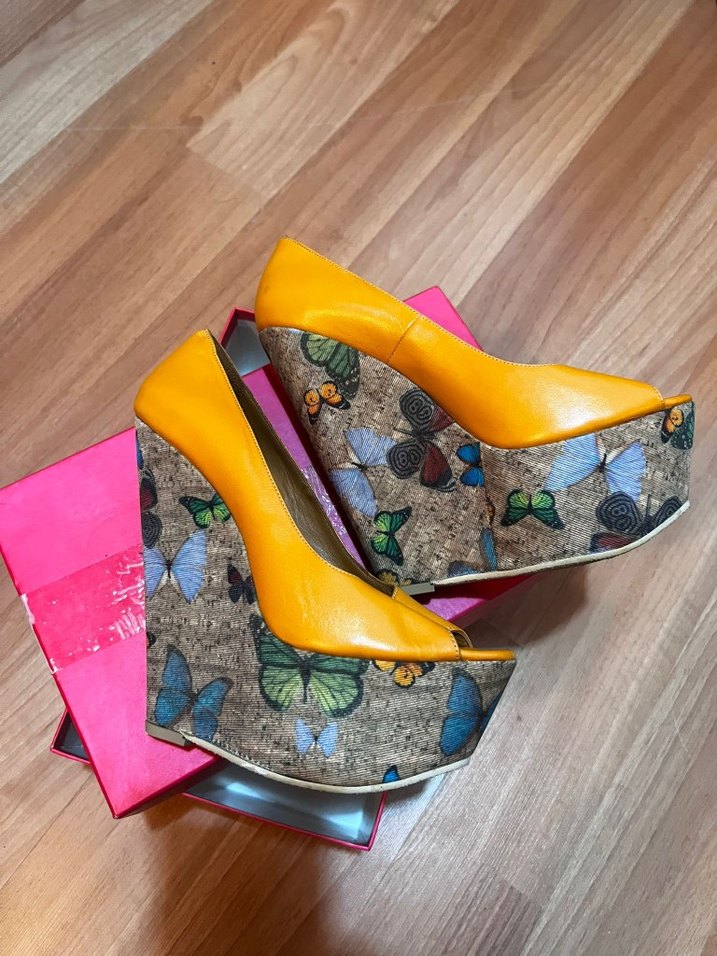 Sarı dolgu topuklu ayakkabılar, platformda renkli kelebek baskısı ve tokalı detay içerir. Parti için avangart tarzda uygun.