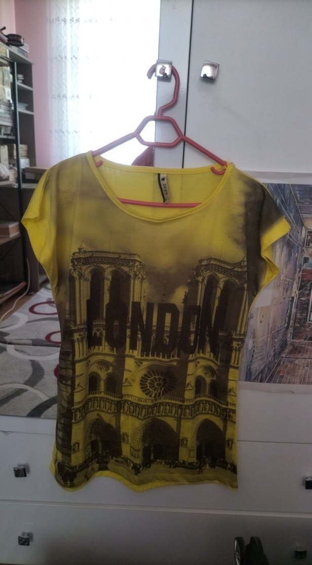 Sarı, kısa kollu, bisiklet yaka ve baskılı Londra şehir manzaralı, parlak kumaştan kadın tişörtü. Günlük kullanım için uygundur.
