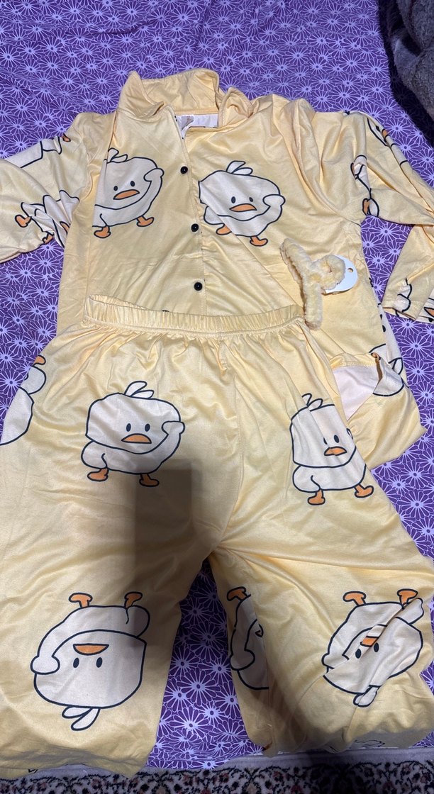Fitted kesim, uzun kollu, sarı baskılı kadın pijama takımı. Normal midi boyda, rahat ve sokak stiline uygun.