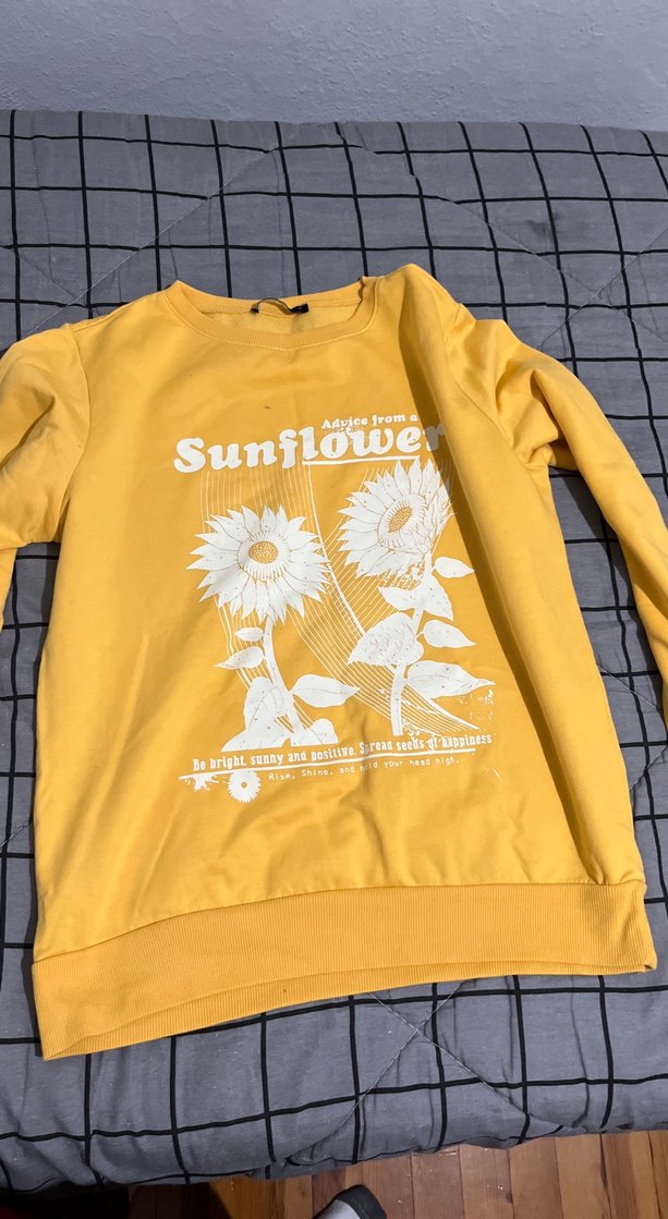 Sarı renkli, uzun kollu, bisiklet yaka kadın sweatshirtü, renkli baskılı ayçiçeği motifiyle. Rahat kesim ve midi boyda, sentetik yumuşak kumaştan üretilmiştir.