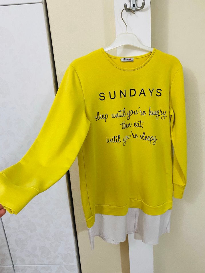 Uzun kollu, salaş kesim sarı sweatshirt, baskılı "SUNDAYS" yazısı ve drapeli kısa boy tasarım içerir.