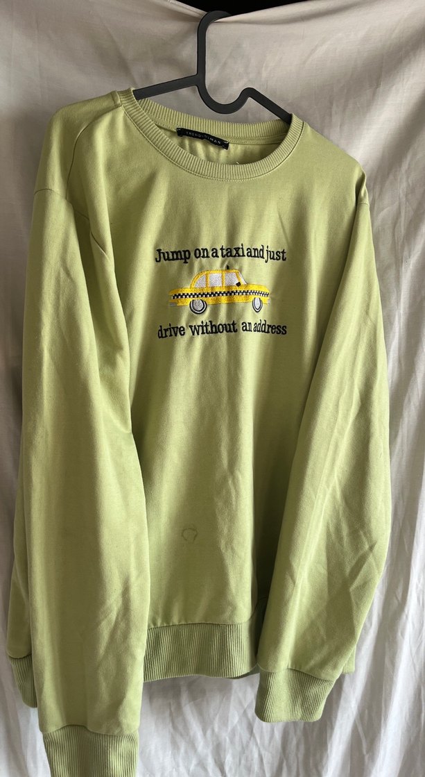 Pastel sarı renkli, uzun kollu, bisiklet yaka ve bol kesim kadın sweatshirtü. Üzerinde 'Jump on a taxi and just drive without an address' yazılı baskı bulunur. Rahat ve sıcak kumaştan üretilmiştir.