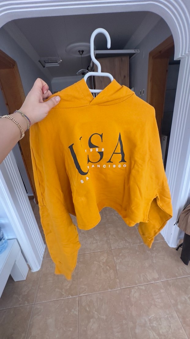 Uzun kollu, bisiklet yaka, bol kesim sarı sweatshirt. Üzerinde 'SA' baskısı bulunur. Parlak, yumuşak sentetik kumaştan yapılmıştır.