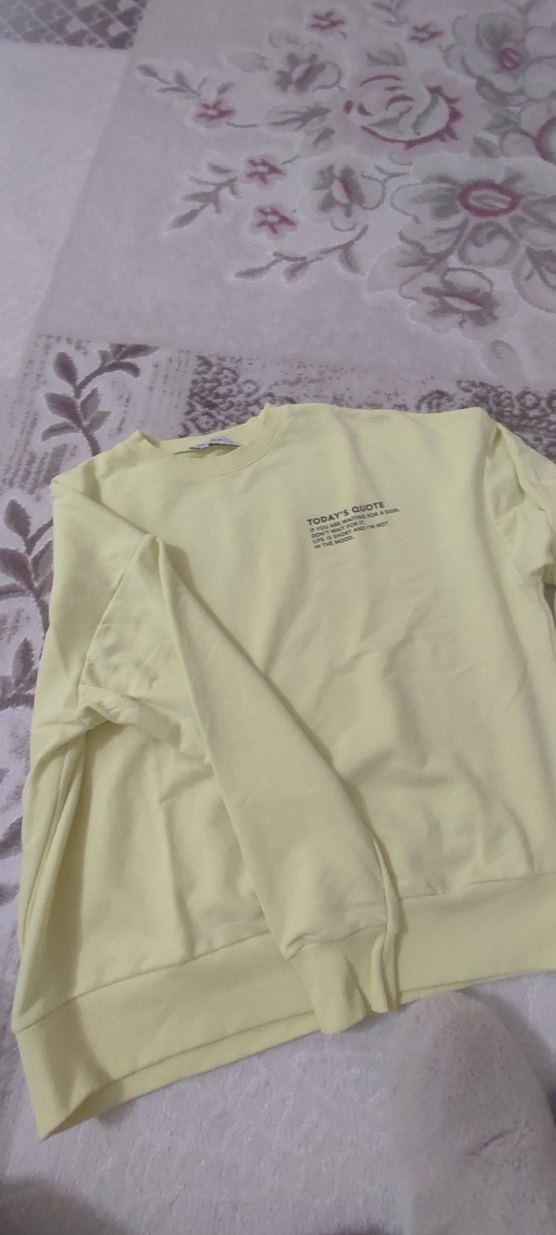 Sarı renkli, uzun kollu, yuvarlak yakalı, rahat kesim pamuklu kadın sweatshirtü. Önünde baskılı alıntı detayı bulunur, günlük rahat stil için uygundur.