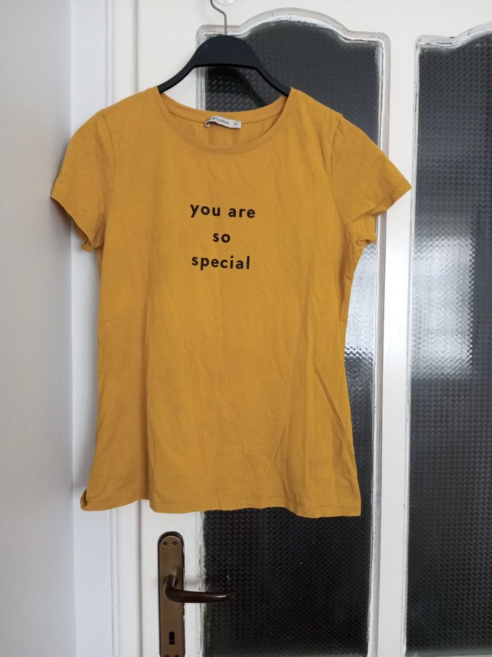 Sarı, kısa kollu, bisiklet yaka, baskılı ve vücuda oturan kadın tişörtü. Günlük kullanıma uygun, rahat ve şık bir sokak stili ürünü. penye
