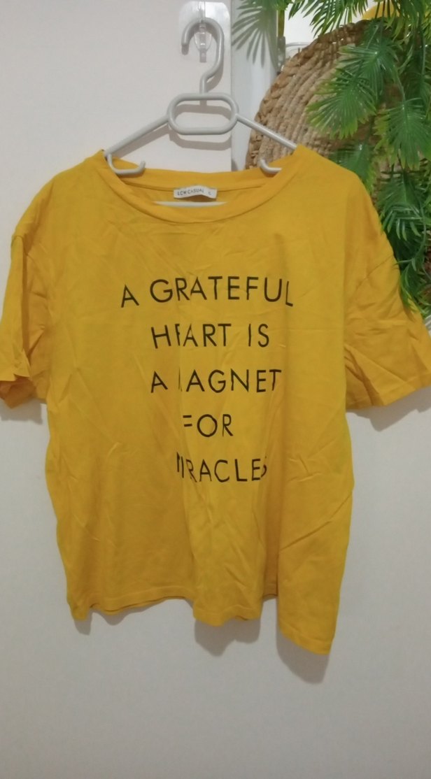 Rahat kesim, kısa kollu, yuvarlak yaka, sarı pamuk tişört. Üzerinde renkli, ilham verici baskı bulunur. Günlük sokak stili için uygun.