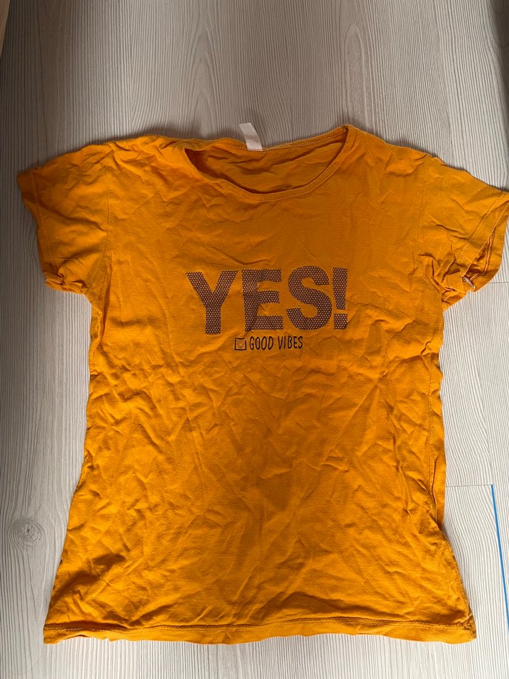 Kısa kollu, yuvarlak yaka, baskılı 'YES!' ve 'GOOD VIBES' yazılı, bol kesim sarı kadın tişörtü.