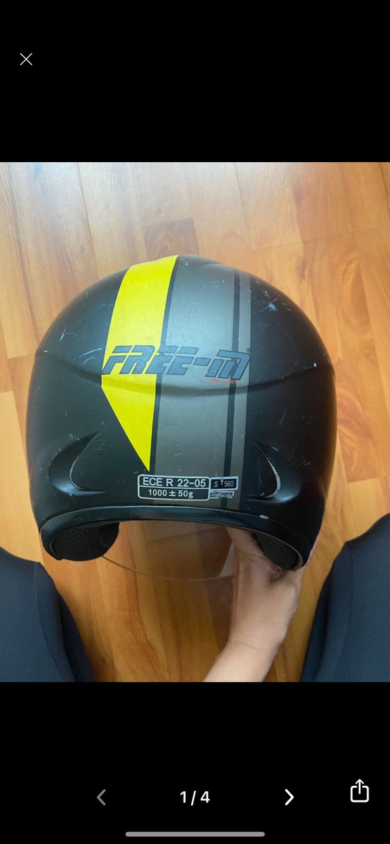 Koyu sarı ve siyah baskılı motosiklet kaskı, kayışlı kapama özelliğine sahip. Kauçuk malzemeden üretilmiş ve ECER22-05 güvenlik sertifikalı. ️