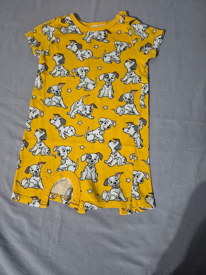 Sarı renkli, kısa kollu ve bisiklet yakalı bebek tulumu, sevimli köpek baskılarıyla süslenmiştir. Yumuşak sentetik kumaştan örme dokusuyla renkli sokak stili sunar.