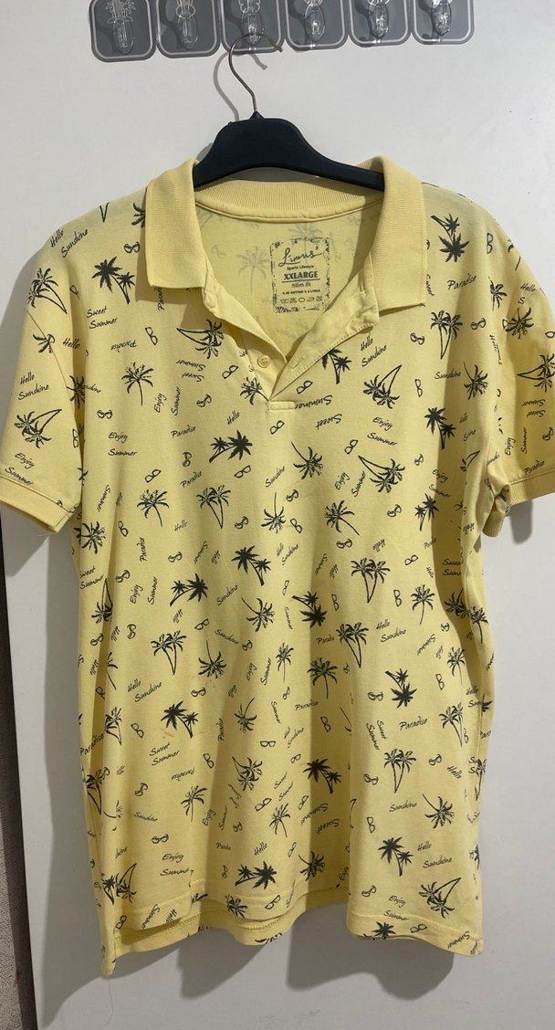 Sarı renkli, baskılı desenlere sahip, düğmeli ve kısa kollu polo tişört. Sentetik kumaştan, rahat kesim ve yakalı tasarım sunar. Günlük kullanıma uygun.
