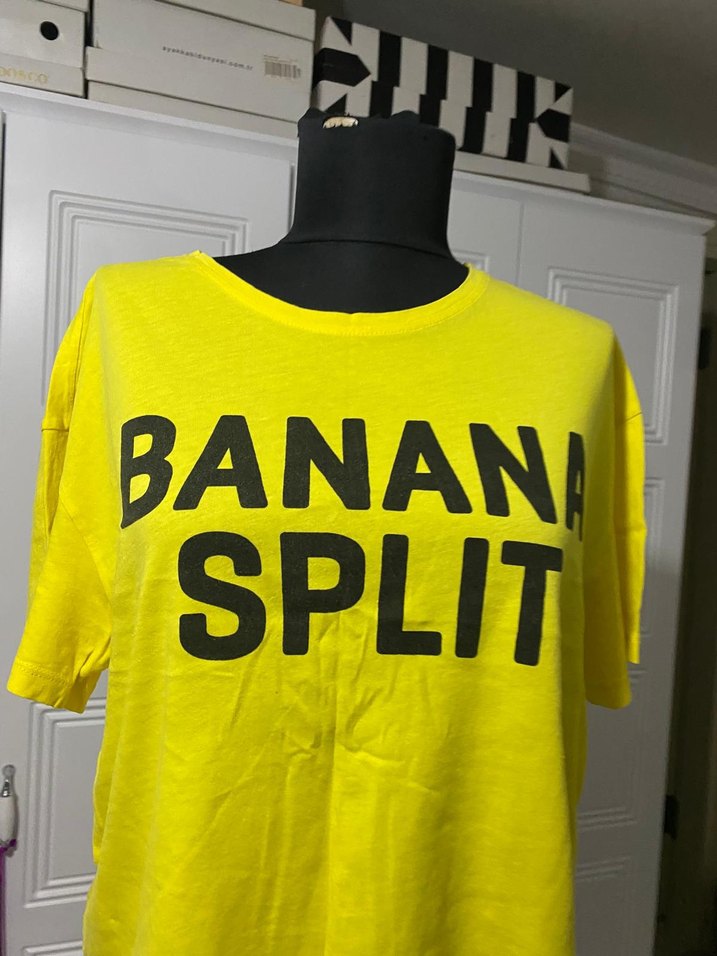 Sarı, pamuk m lu kumaştan, baskılı 'BANANA SPLIT' yazılı, kısa kollu, yuvarlak yakalı, bol kesim. Spor ve sokak tarzına uygun.