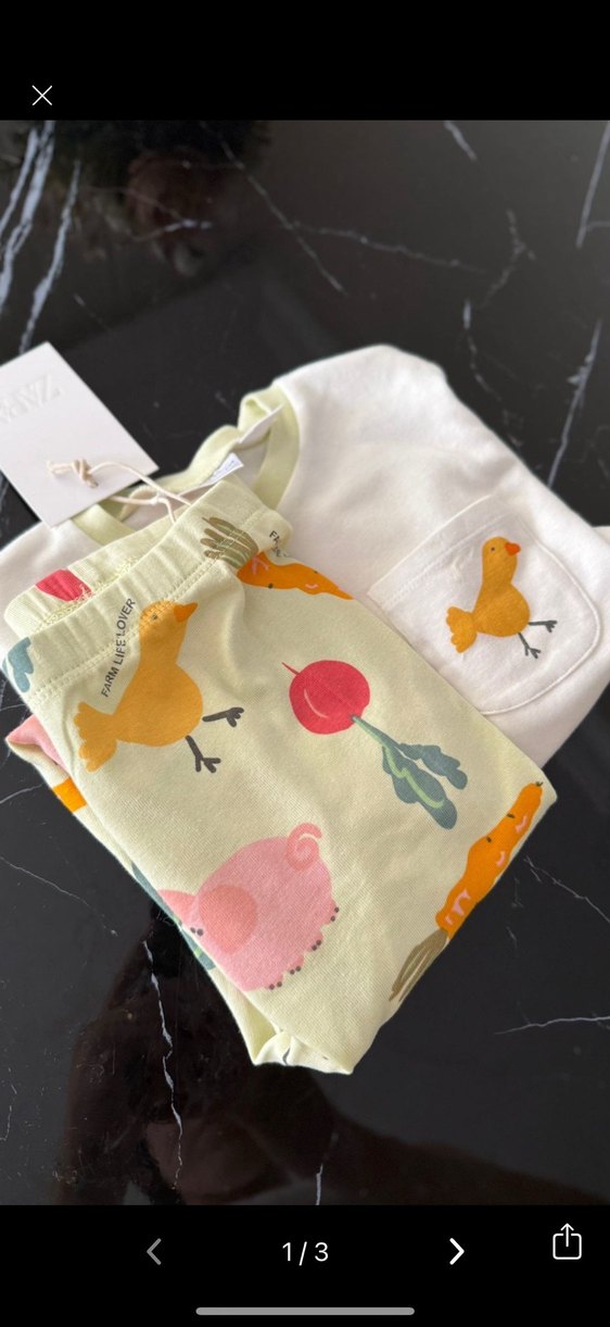 Küçük cepte civciv baskılı kısa kollu üst ve renkli hayvan desenli sarı pantolon içeren yumuşak kumaşlı kız bebek takımı. 4 yaş