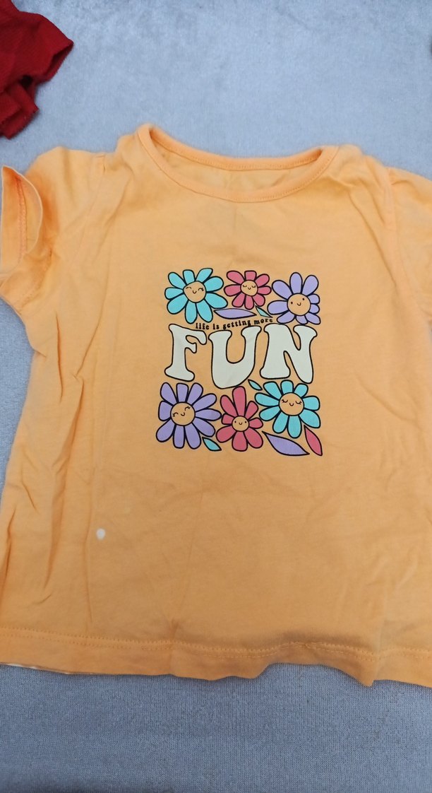 Toplam 7 parça. 9-18 ay arası uyumluSarı renkli, bol kesim kısa kollu kız çocuk tişörtü. Önünde renkli çiçek baskısı ve "FUN" yazısı bulunur. Yumuşak sentetik kumaştan üretilmiştir.