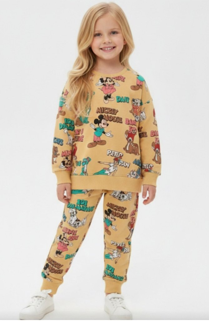 Yumuşak kumaştan, baskılı pop kültür desenli, uzun kollu, oversize kesim sarı kız çocuk eşofman takımı, puff detaylı ve bisiklet yaka.