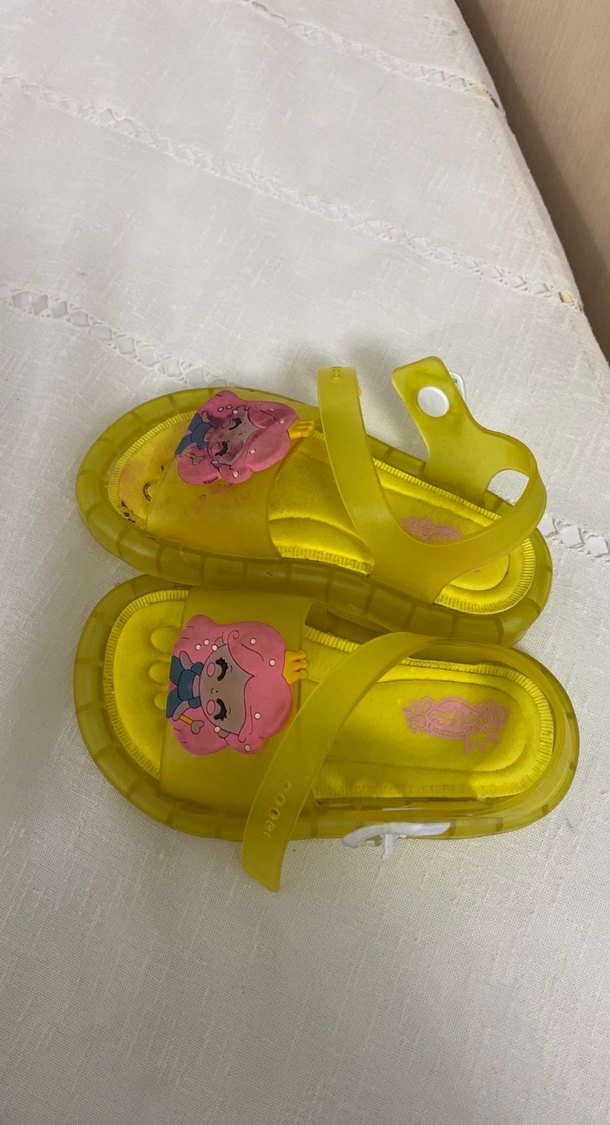 Sarı kauçuk kız çocuk sandaletleri, renkli pop kültür baskıları ve tokalı kayışlarla retro bohem tarzını yansıtıyor.