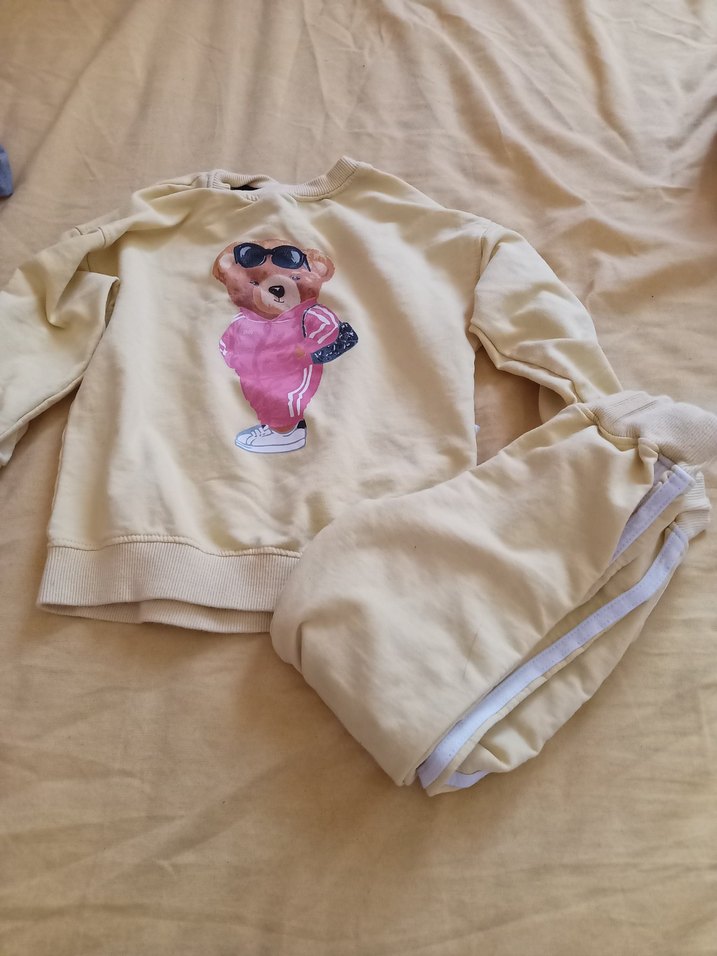 Sarı renkli, baskılı ayıcık desenli kız sweatshirt ve eşofman takımı. Yuvarlak yaka, uzun kollu ve rahat kesim. Yumuşak ve sıcak kumaştan üretilmiştir.