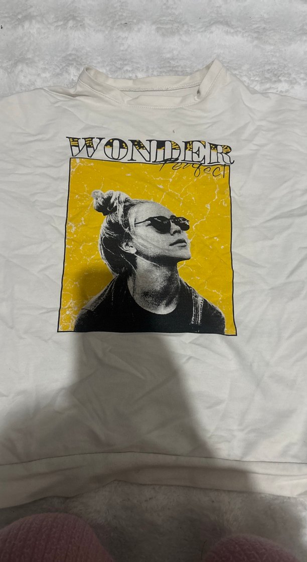 Sarı keten kumaştan, kısa kollu, bisiklet yaka, bol kesim kız tişörtü. Rock punk tarzında baskılı desen içerir.