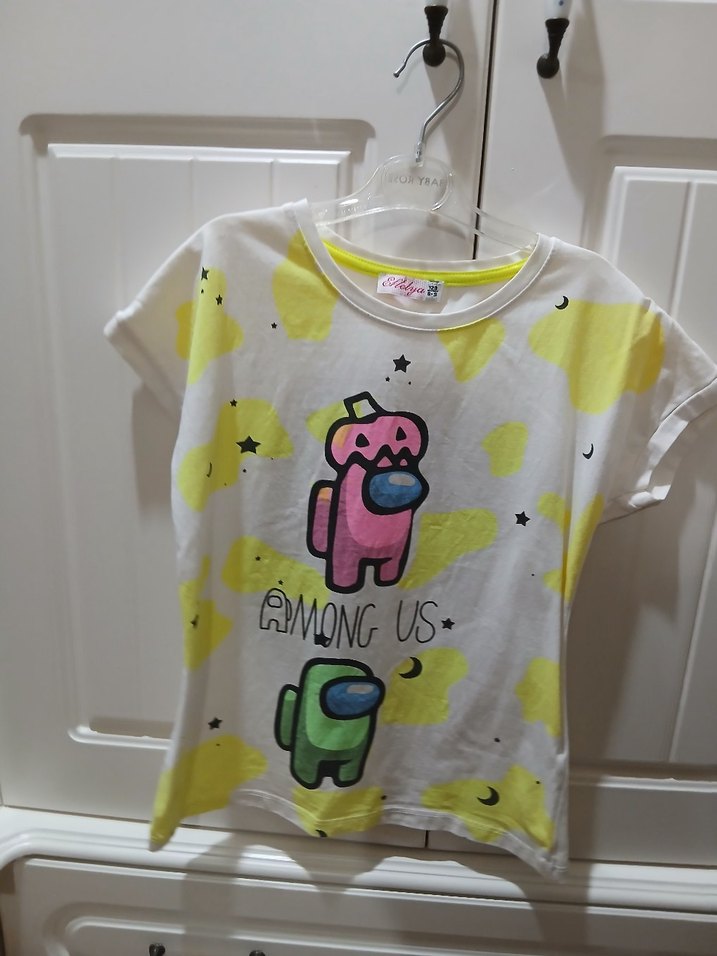 Kısa kollu, yuvarlak yaka, düğmeli sarı baskılı kız tişörtü. AMONG US karakterleriyle desenli, bol kesim ve yumuşak dokulu kumaştan yapılmıştır.