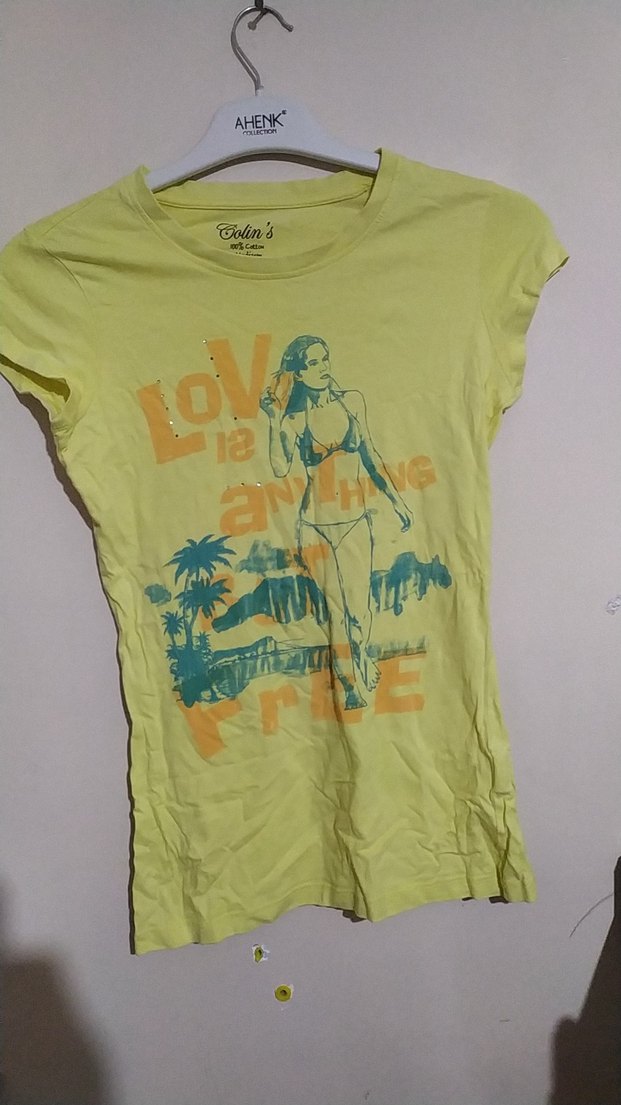 Sarı renkli, pamuklu, kısa kollu kız tişörtü. Bol kesim ve yuvarlak yaka ile rahat bir kullanım sunar. Baskılı retro desenleriyle bohem tarzı yansıtır. Markası Folin's.