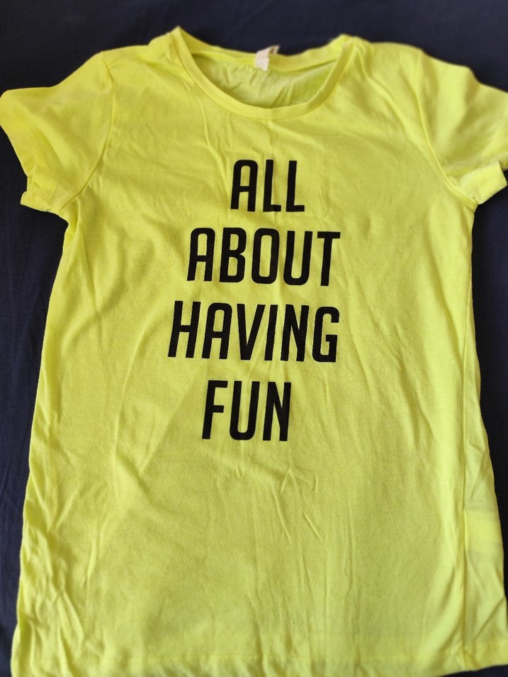 Sarı, baskılı ve rahat kesim kısa kollu kız tişörtü. Üzerinde 'ALL ABOUT HAVING FUN' yazısı bulunur.