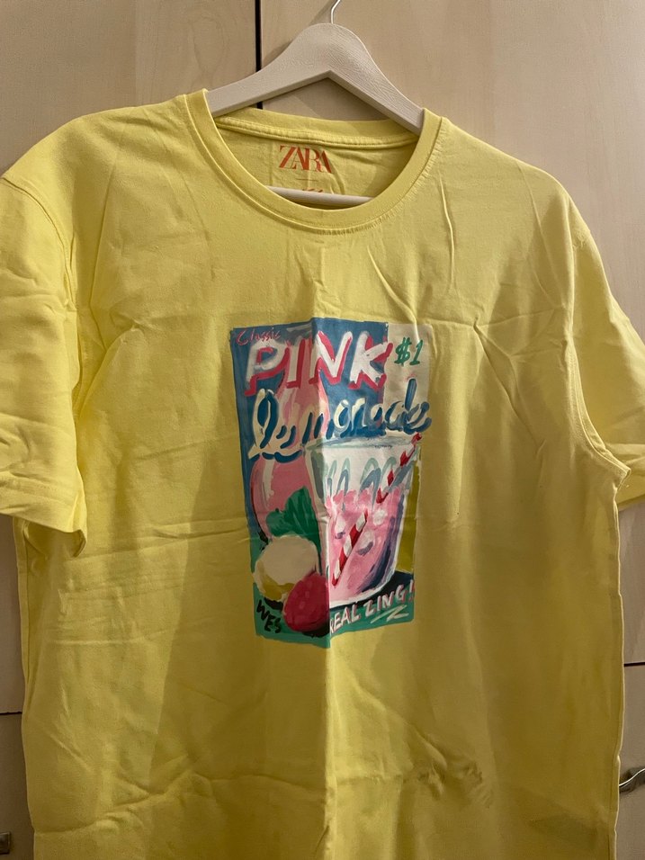 Zara sarı kız tişörtü, pastel baskılı tasarıma sahip pamuk kumaştan üretilmiştir. Yuvarlak yaka, kısa kollu ve rahat bir kesime sahiptir. Bavulda kirlenmiş ama denedim çıkıyor.