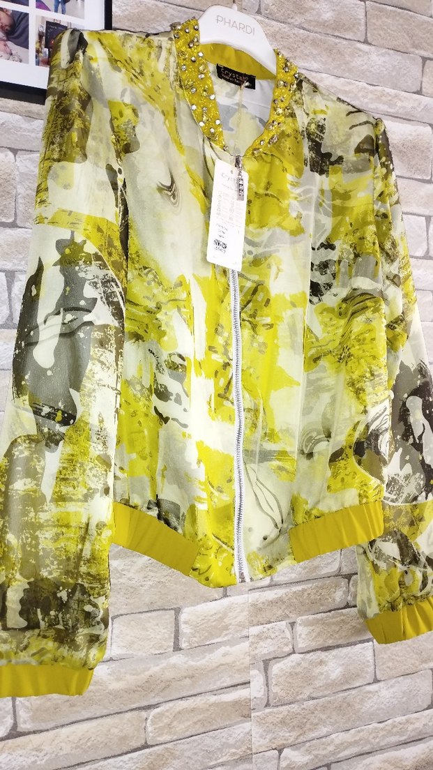 Sarı baskılı mini ceket, uzun kollu ve straplez yakalıdır. Sentetik kumaştan üretilmiş, fermuarlı ve bol kesimdir. Sokak stili için uygundur.