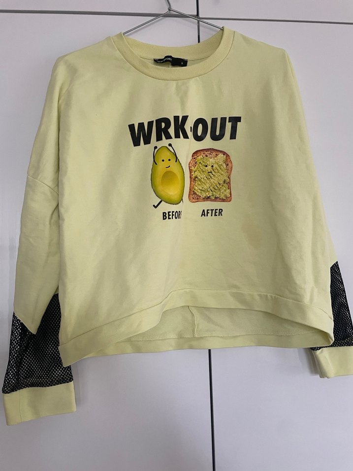 Sarı pamuklu, uzun kollu, salaş kesim mini sweatshirt. Üzerinde spor temalı eğlenceli baskı ve düğme detayları bulunur. ️♀️