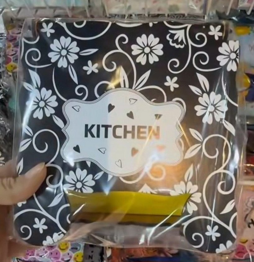 Sarı renkli, üzerinde "KITCHEN" yazısı ve çiçek desenleri bulunan baskılı mutfak önlüğü. kutulu pecetelik