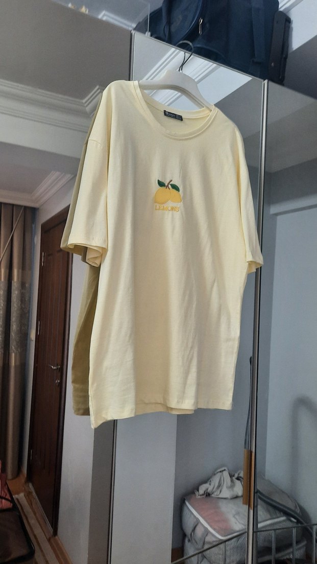 Pamuk sarı tişört, kısa kollu ve yuvarlak yakalıdır. Oversize kesimi ve minimal limon baskısıyla rahat ve şık bir sokak stili sunar.