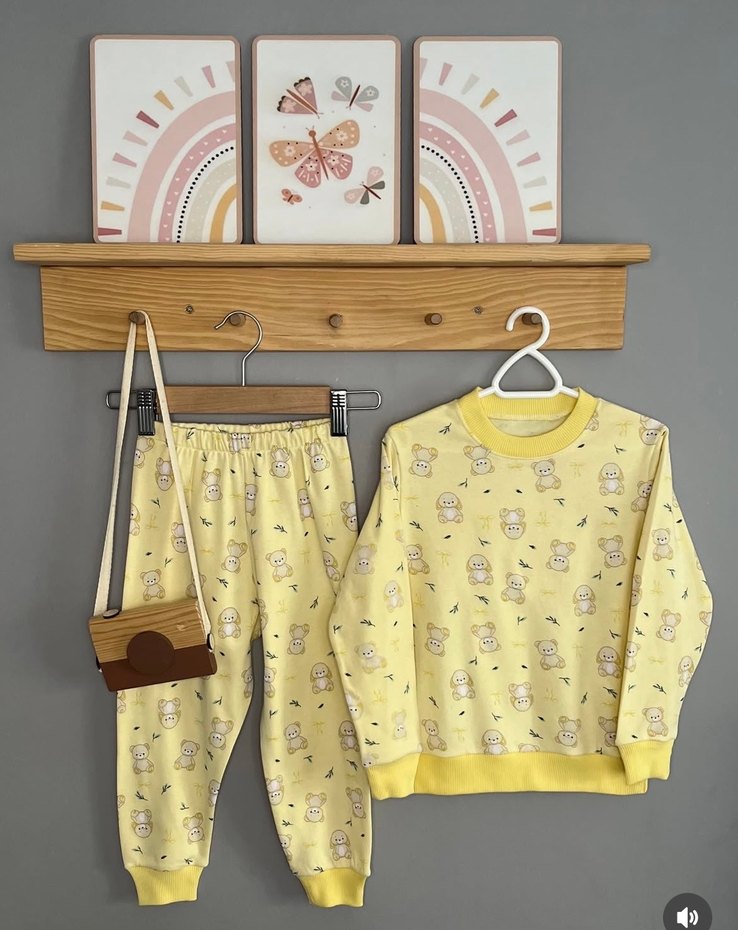 Pastel sarı renkte, pamuklu kumaştan yapılmış çocuk pijama takımı. Uzun kollu üst ve baskılı desenli rahat pantolon içerir.