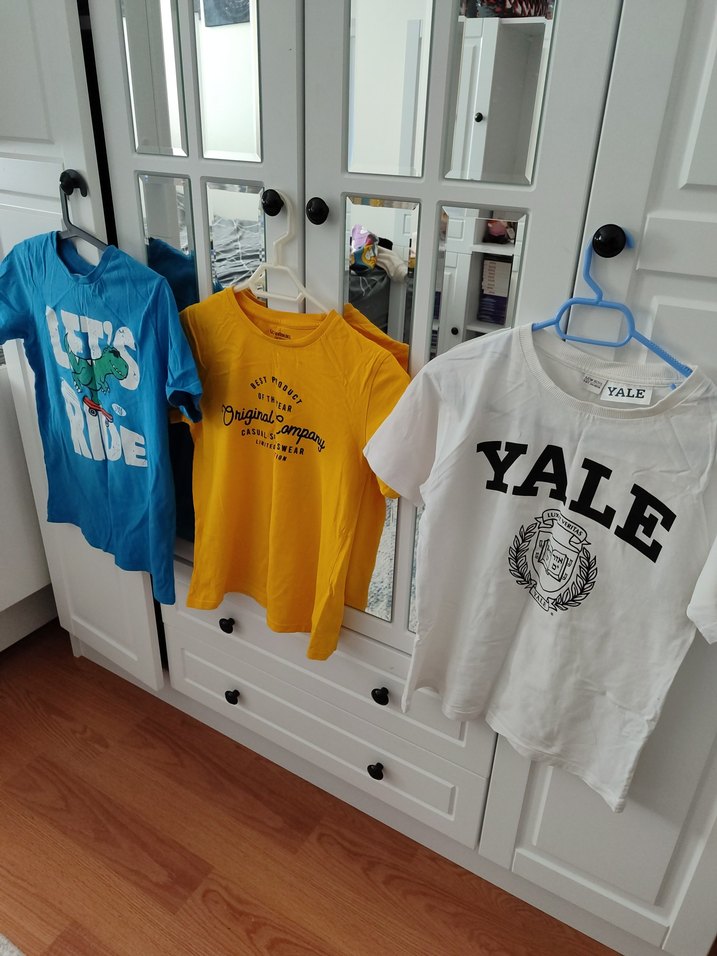 Pamuklu, kısa kollu, yuvarlak yakalı, bol kesim, sarı mavi , beyaz renkli erkek tişörtü. Üzerinde "YALE" baskısı bulunur. Rahat sokak stili için uygun.
