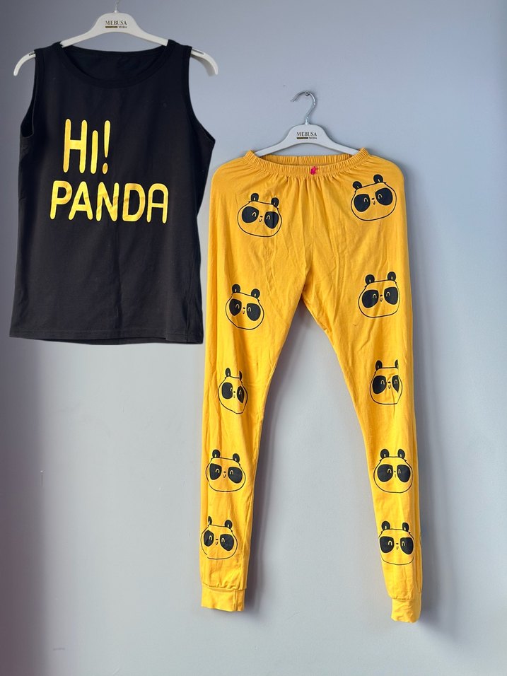 Siyah kolsuz üstte 'HI! PANDA' yazısı, sarı bol paça pantolonda panda yüzleri baskılı kadın pijama takımı.