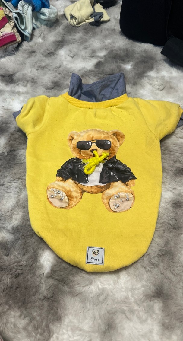 Sarı renkte, peluş detaylı ve renkli baskılı ayıcık figürlü köpek kıyafeti, sokak stili için sıcak ve eğlenceli bir seçenek sunar.