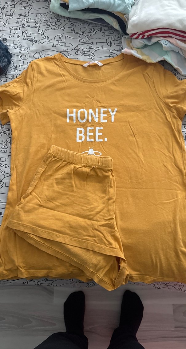 Sarı baskılı pijama takımı pamuklu kumaştan, kısa kollu ve rahat kesimlidir. 'HONEY BEE.' yazısı ile günlük kullanıma uygundur.
