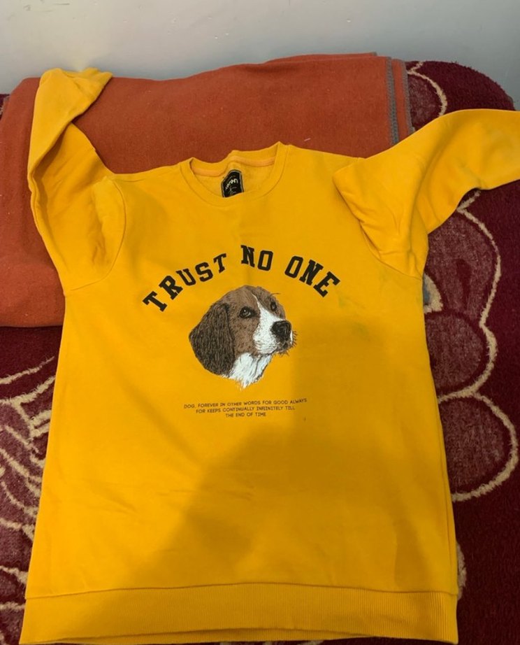 Parlak sarı renkte, "TRUST NO ONE" yazılı ve köpek baskılı rahat sokak stili köpek kıyafeti.