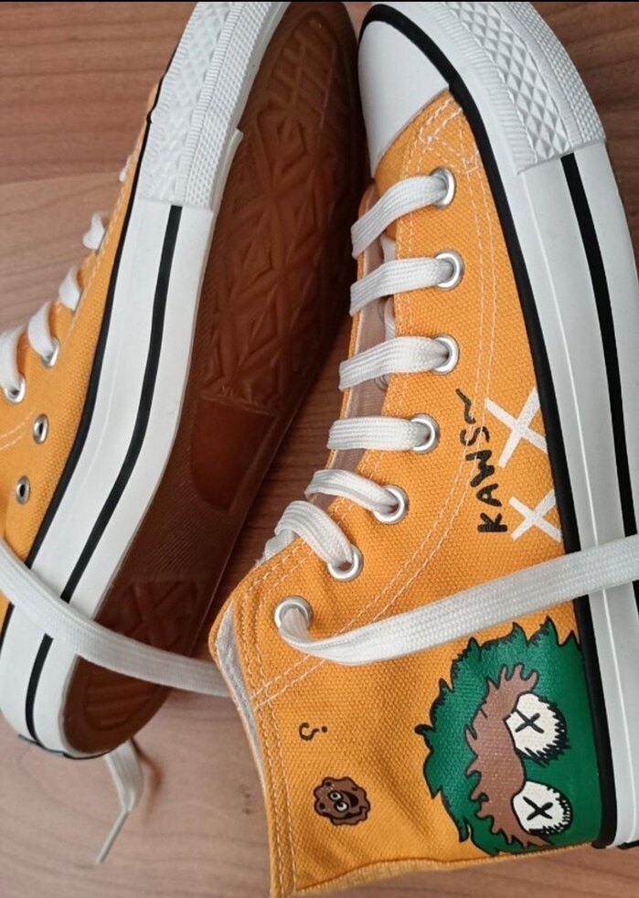Sarı, baskılı, düz tabanlı ve elastik detaylara sahip kadın spor ayakkabısı. Sokak tarzına uygun, günlük kullanım için ideal.