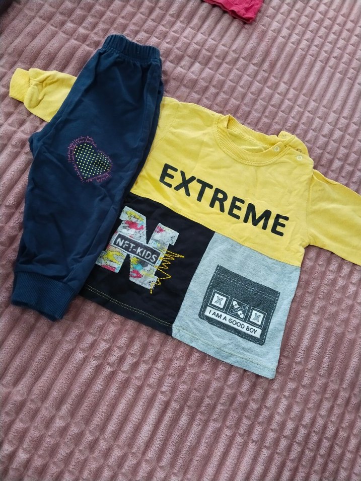 Renkli erkek bebek takımı, uzun kollu sarı baskılı üst ve lacivert elastik bel pantolon içerir. Sentetik kumaş, yuvarlak yaka ve rahat tasarım.