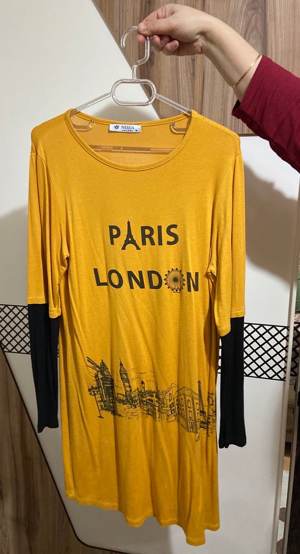 Pamuklu, koyu sarı renkte, baskılı Paris ve Londra şehir temalı, uzun kollu, bol kesim kadın tişörtü. Yuvarlak yaka, günlük sokak stili. ️