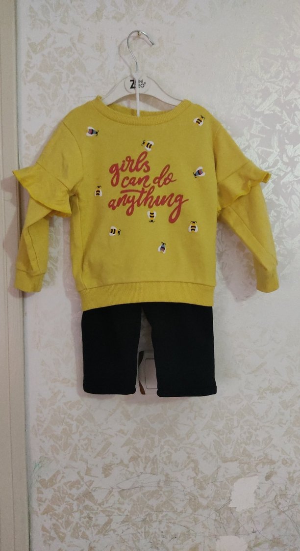 Sarı, uzun kollu, örgü kumaştan yapılmış, renkli baskılı arılar ve "girls can do anything" yazısı bulunan üst ile siyah pantolon takımı. her hangi bir sorunu yok 18 aylık yazıyor ama 1 yaş için ideal