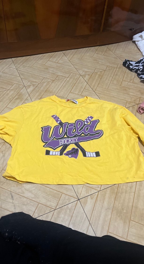 Sarı, salaş kesim, uzun kollu, bisiklet yaka tişört. Renkli baskılı 'Wild' ve hockey temalı desen içerir. Sentetik kumaştan, tokalı detaylı.