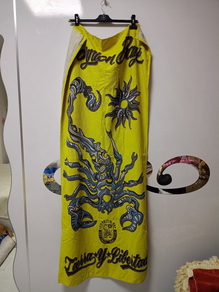 Uzun sarı plaj havlusu, renkli baskılı ve avangart tarzda, şık bir görünüm için drapelenmiş. Günlük kullanım için uygundur. ️