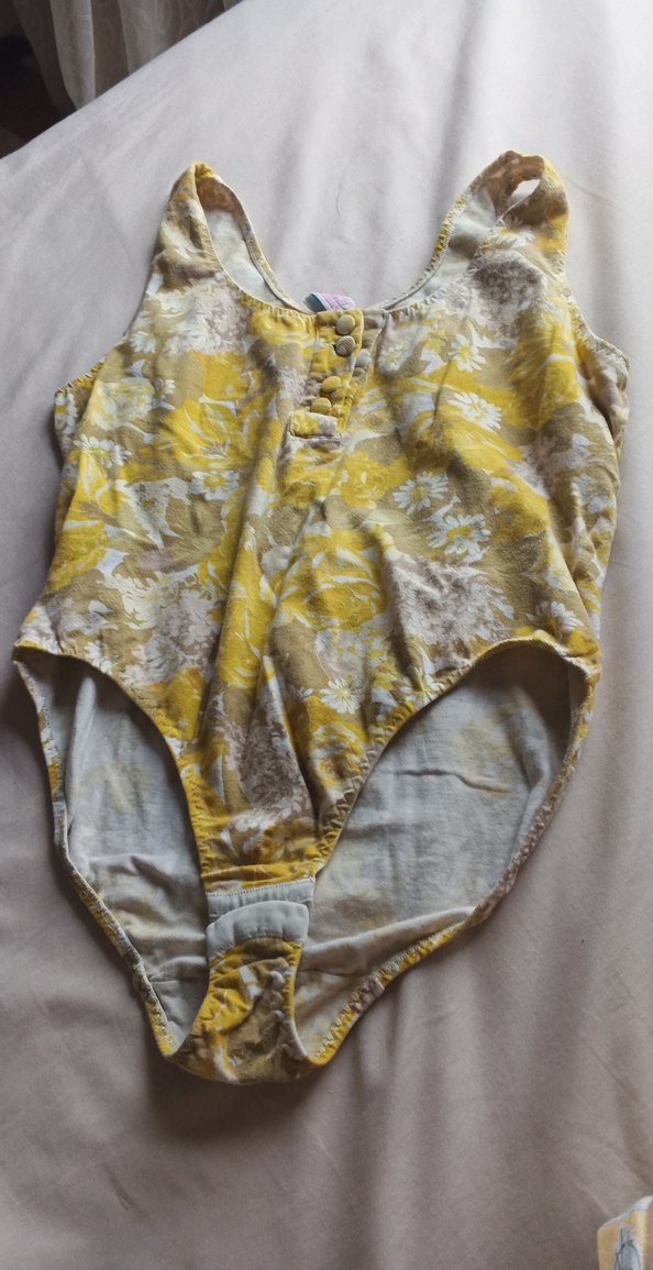 Kolsuz, sarı batik desenli mayo . V yaka ve ön düğmeli, bol kesim ve normal boyda. 38 44 beden aralığında olmaktadır