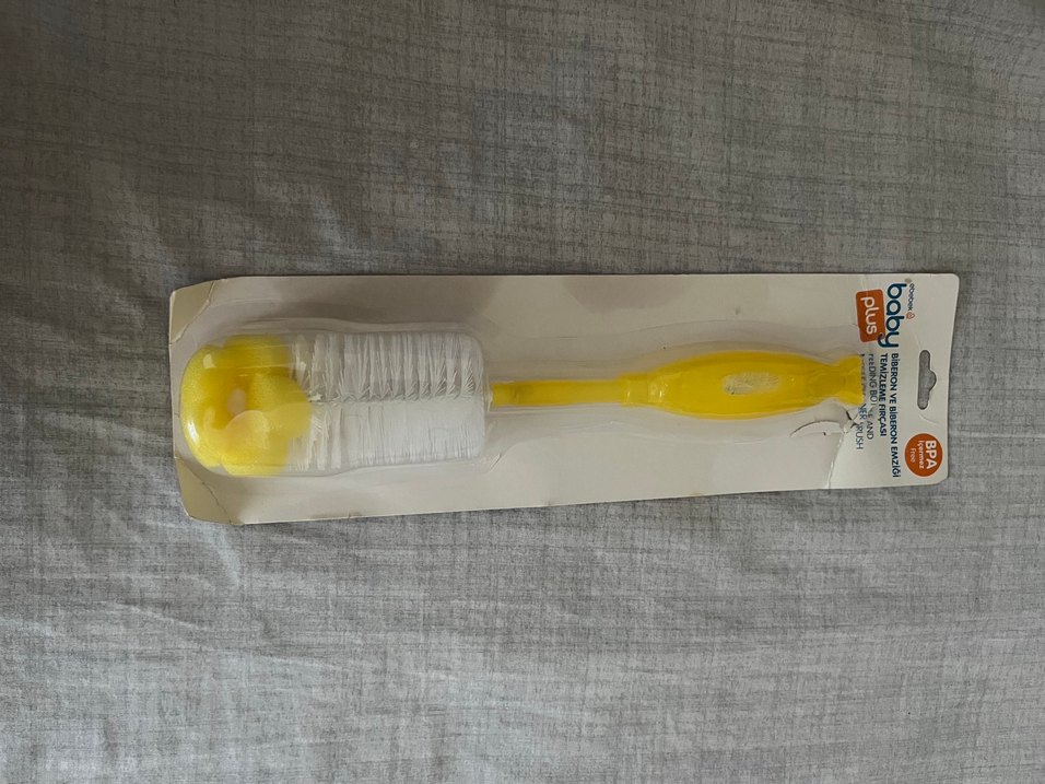 Uzun saplı ve yumuşak kıllı sarı bebek biberon temizleme fırçası, biberonları kolayca temizlemek için tasarlanmıştır.
